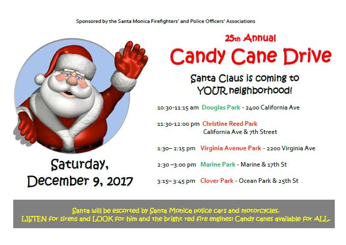 SANTA MONICA—The Santa Monica Police Department and Santa Monica Fire Department will help usher Santa Claus in town as the city hosts its 25th Annual “Candy Cane Drive” on Saturday, December 9.