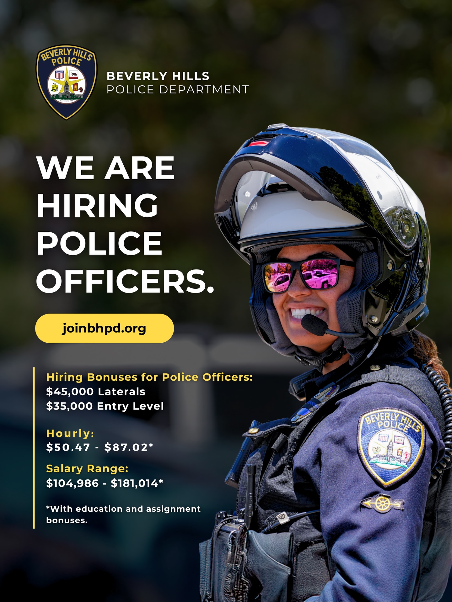 To learn more or apply at joinbhpd.org. For guidance and questions, send an email to our Recruitment Officer at mgarrido@beverlyhills.org.
