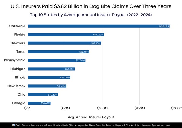 According to an analysis by Steve Gimblin Personal Injury & Car Accident Lawyers, the study examined dog bite liability claim data published by the Insurance Information Institute (III) for the years 2022, 2023, and 2024, ranking the 10 highest-volume states by their three-year average annual total insurer payouts.