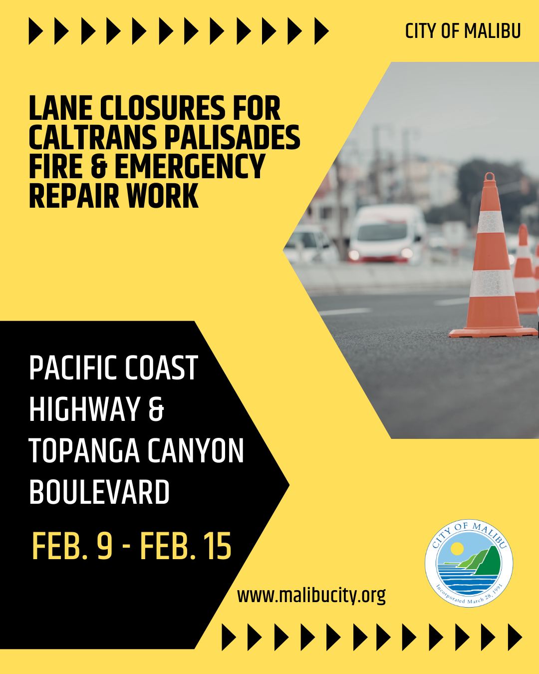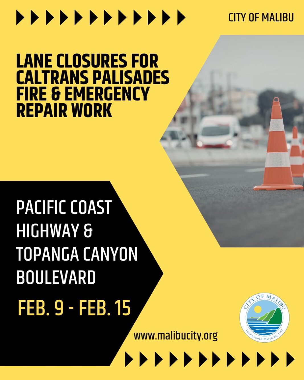 • No Caltrans work on PCH: 6 a.m. Friday, February 13 – 11:59 p.m. Monday, February 16