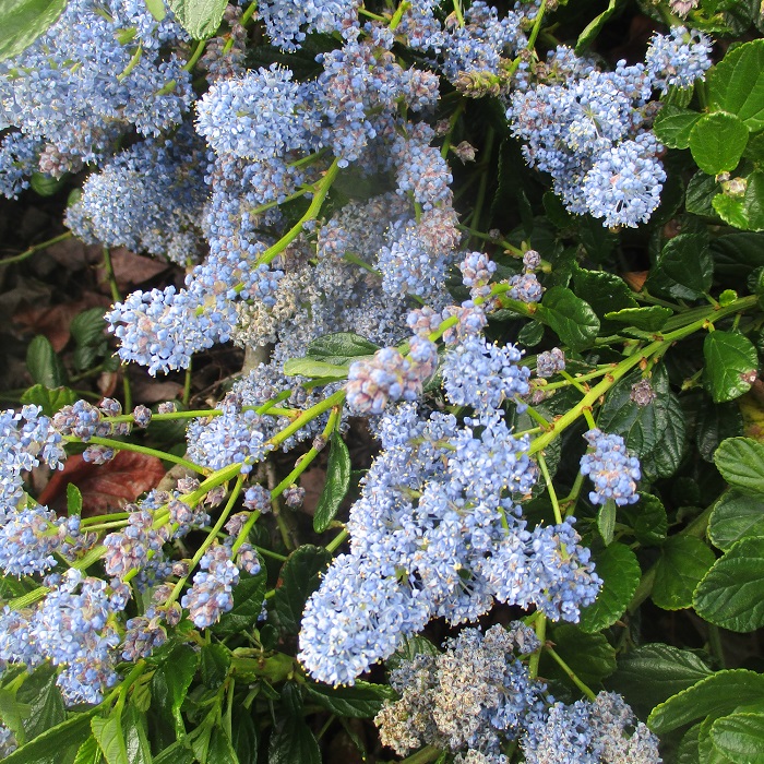 Its narrow native range stays near to the North and Central Coast of California, including Carmel. However, its nomenclature is all over the map. The genus is Ceanothus. After that, the species name might be any combination of thyrsiflorus, griseus or horizontalis, or omitted. ‘Carmel Creeper’ is its cultivar name, with or without the species designation.