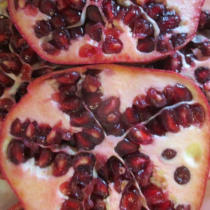 Pomegranate fruit ripens so late during autumn that it can linger after autumn defoliation. It is generally brownish red. Individual fruits are about three or four inches wide but may be wider. They contain hundreds of seeds, which are surrounded by juicy and succulent flesh. Such flesh is generally garnet red, but might be purplish, pinkish or even colorless. Flowers are edible too.