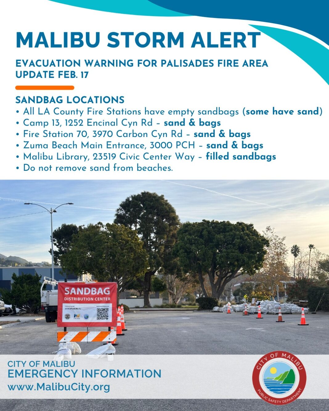 • Malibu Library, 23519 Civic Center Way – filled sandbags available through Apr 15 (vehicle loading 9:00 AM–4:00 PM before and during storms)
