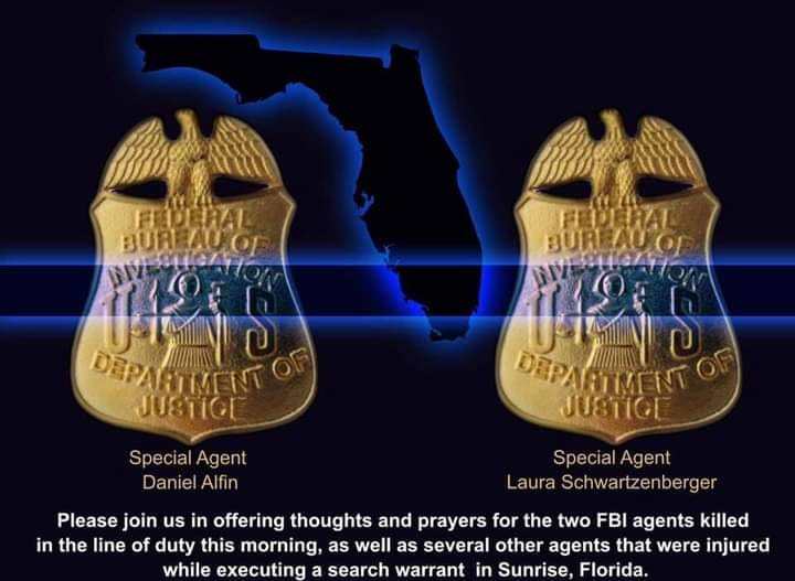 “Tragically, the FBI lost two of our own today. Special Agent Daniel Alfin and Special Agent Laura Schwartzenberger were shot and killed this morning in the line of duty while executing a federal court-ordered search warrant in a Crimes Against Children investigation in Sunrise, Florida. Three other agents were shot and wounded; two suffered injuries requiring hospital care, but both are now in stable condition. The third injured agent did not require hospitalization.”