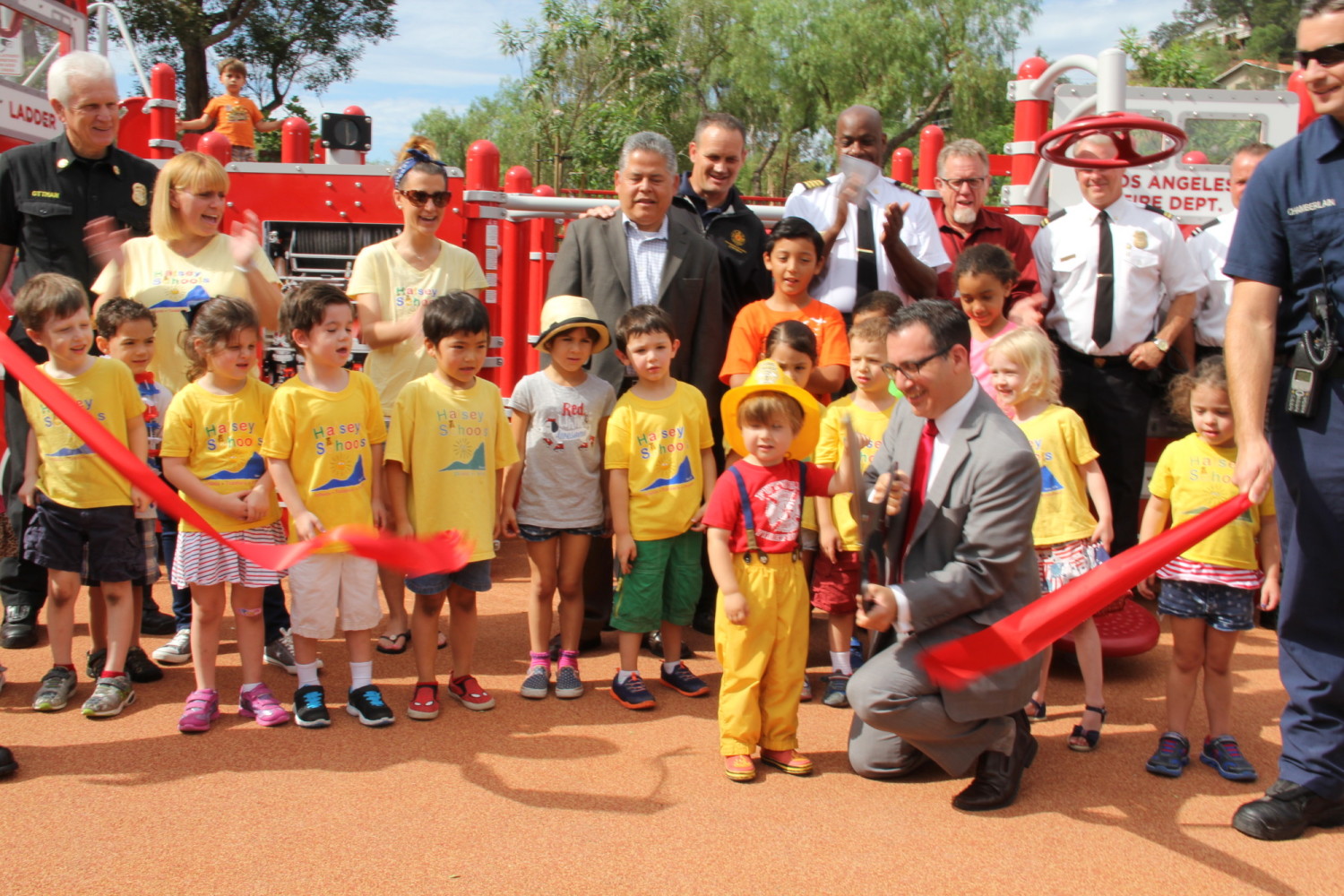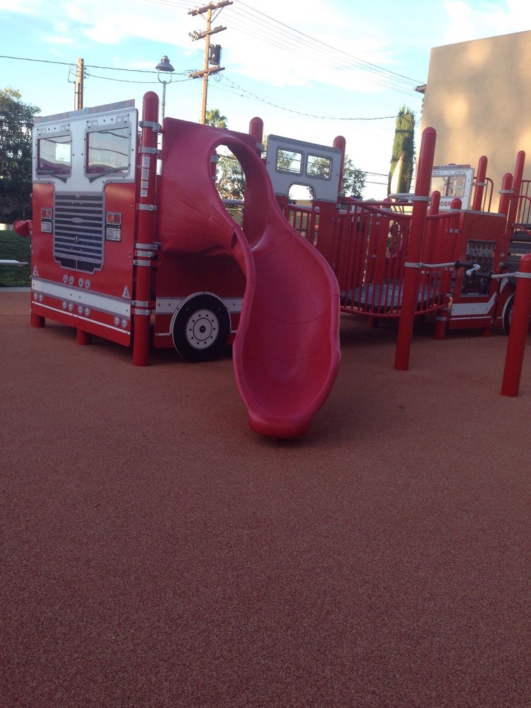 The 8,125 square foot park cost $1 million to build. Its main attraction is a jungle gym in the shape of a bright red firetruck, as well as “a small glade [and] a drought tolerant garden,” according to the Los Angeles Daily News.