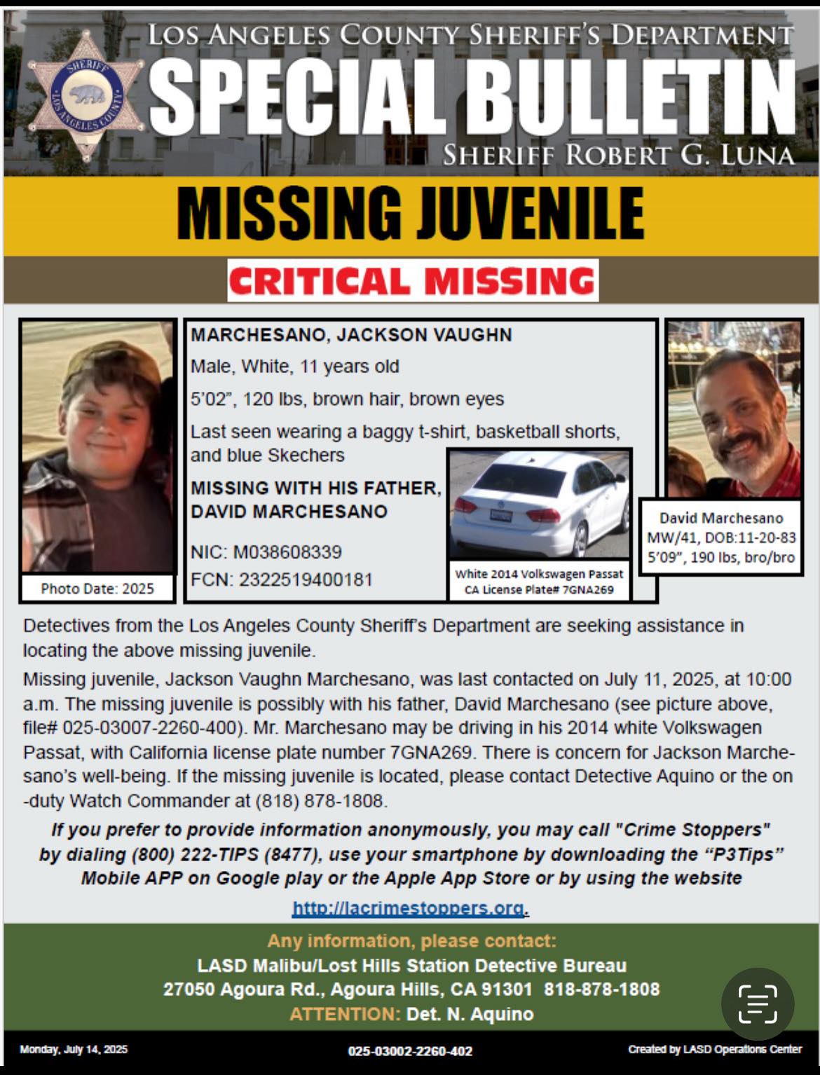 MALIBU—The LASD Malibu/Lost Hills Station is asking for the public’s help to locate a missing child and his father.