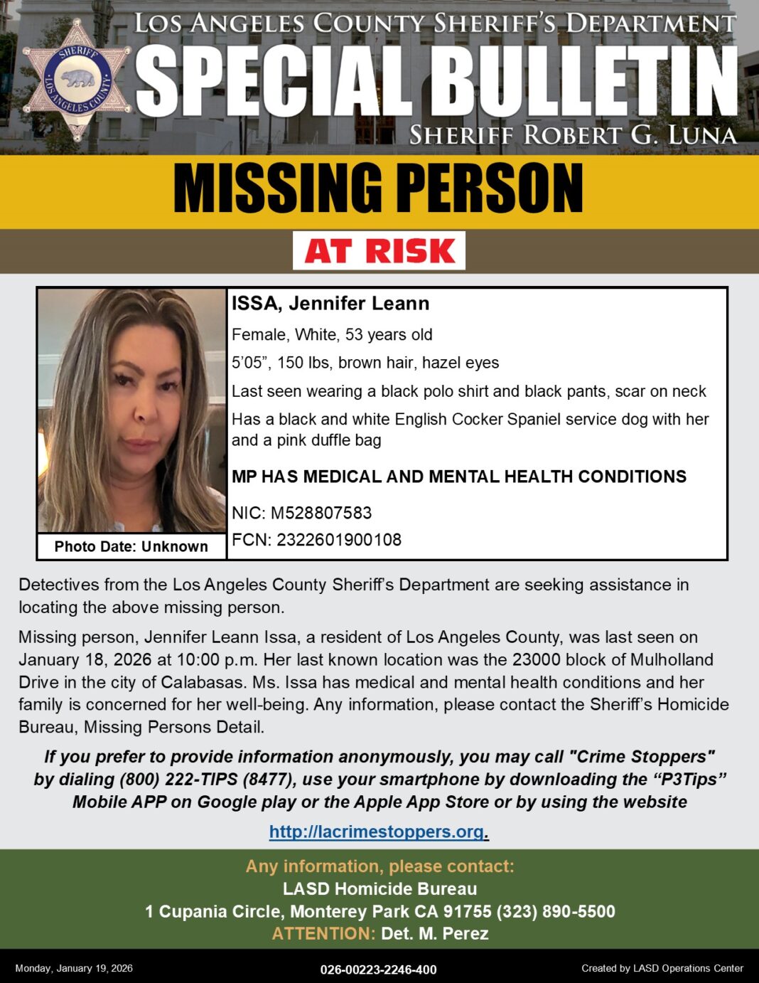 MULHOLLAND—On Tuesday, January 20, the Los Angeles County Sheriff’s Department announced they are asking for the public’s help locating missing person, Jennifer Leann Issa. She is a 53-year-old Caucasian female who was last seen on January 18, at 10 p.m., on the 23000 block of Mullholland Drive, in the city of Calabasas.