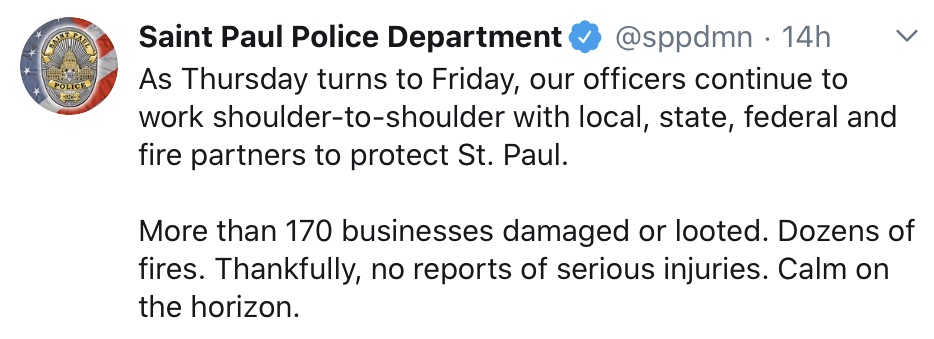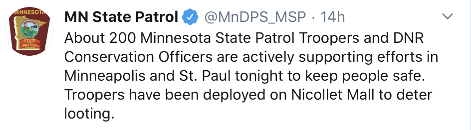 “Shortly after 10:00 pm tonight, in the interest of the safety of our personnel, the Minneapolis Police Department evacuated the 3rd Precinct of its staff. Protesters forcibly entered the building and have ignited several fires. No further information is available.”