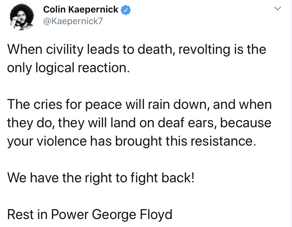 Numerous claims have arisen online stating that a Tweet by ex-NFL quarterback Colin Kaepernick helped incite the violence.