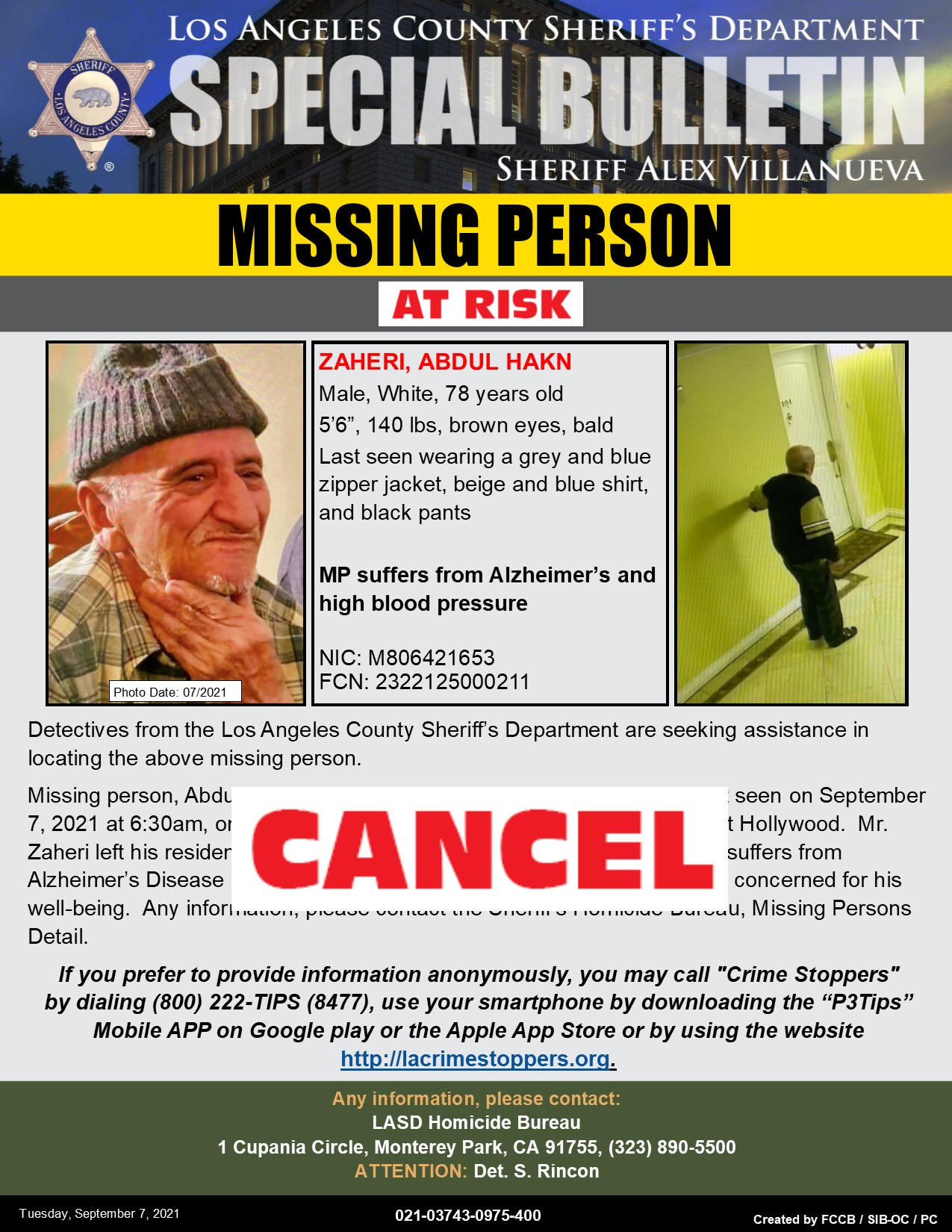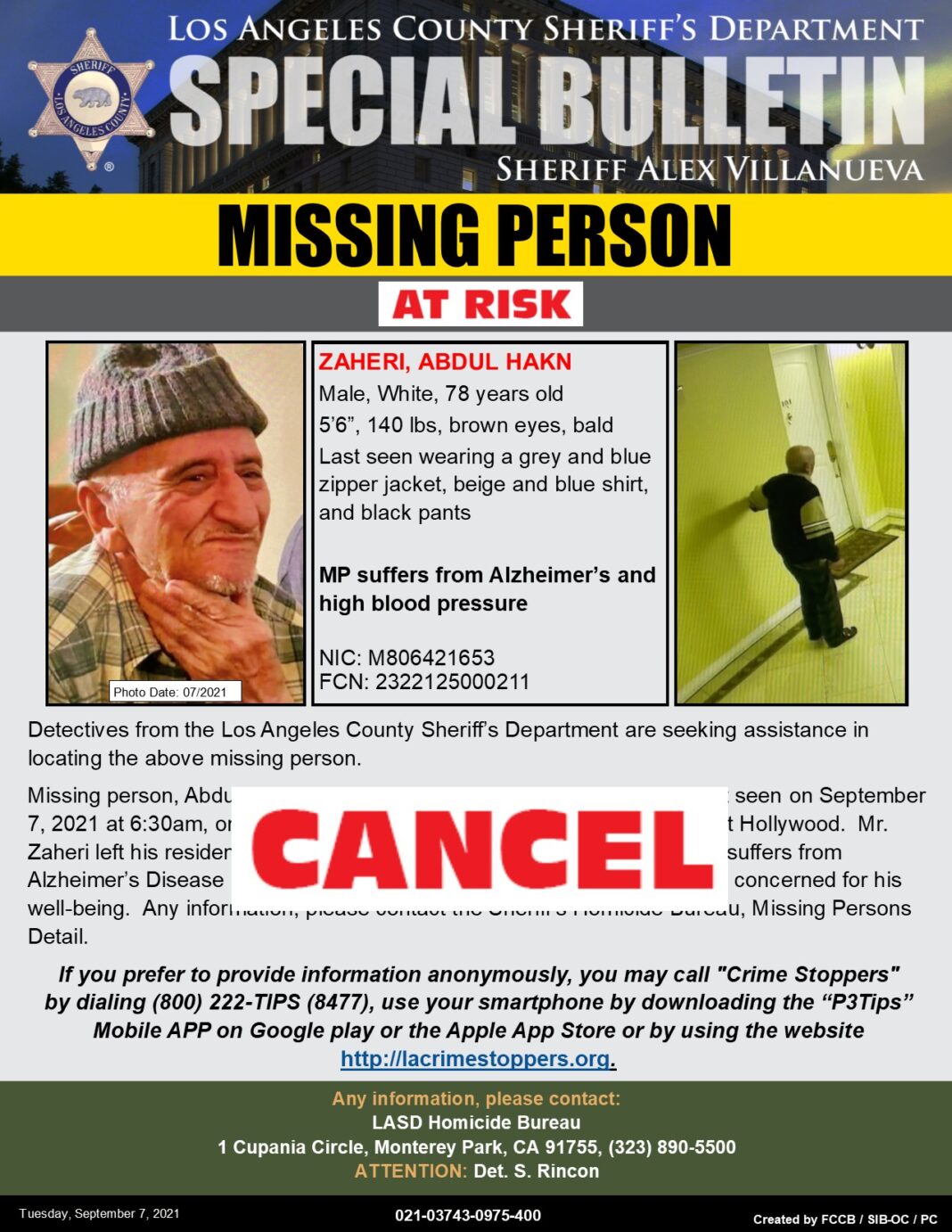 He was reported missing on Tuesday, September 7, after last being seen at 6:30 a.m. on the 1400 block of Laurel Avenue in West Hollywood. Zaheri, 78, suffers from Alzheimer’s disease and has high blood pressure. He was last wearing a grey zipper jacket, beige and blue shirt and black pants at the time of his disappearance.