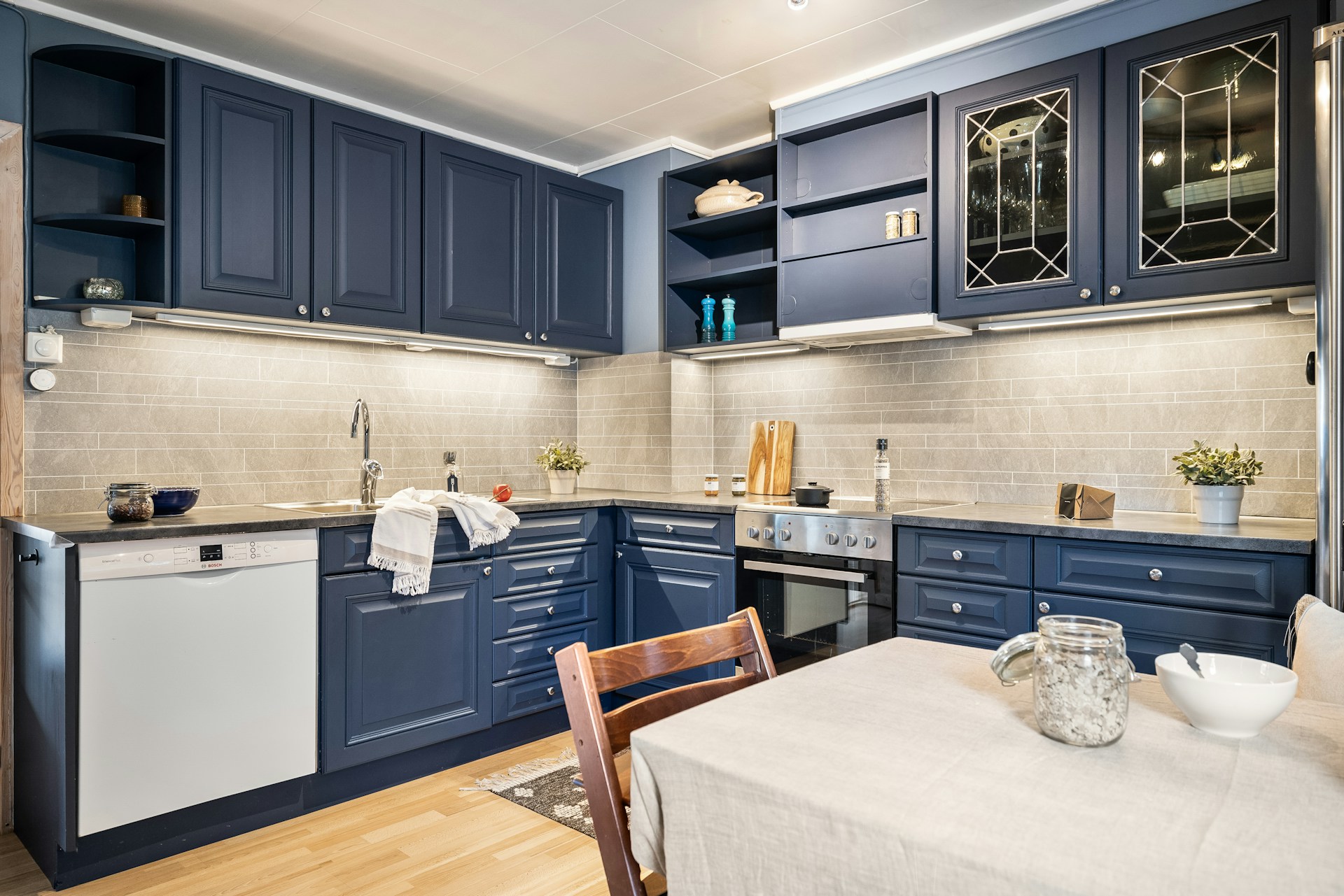 Accessories can enhance the appeal of navy-blue cabinets. Use colorful platters to bring your home to life and plants to add natural elements and balance. Make sure that the colors of the rugs or cushions complement the other colors in the room to create a balanced design and cohesive look.