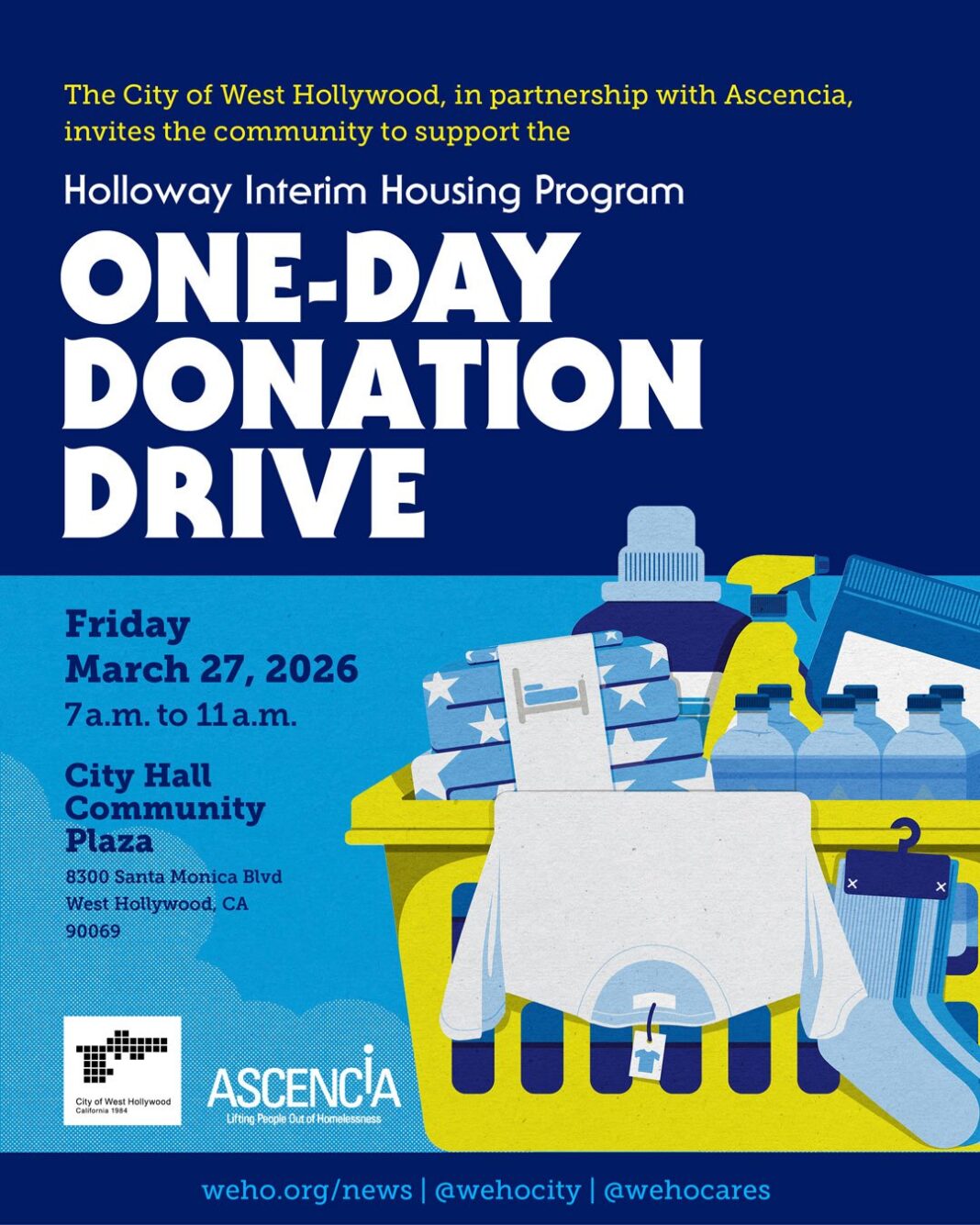 The drop-off event donation will take place on Friday, March 27 from 7 a.m. to 11 a.m. at West Hollywood City Hall Community Plaza.