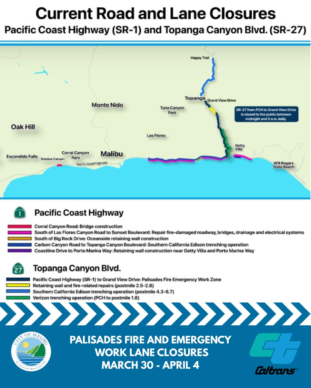 From Monday, March 30 thru Saturday, April 4, drivers should expect delays on Pacific Coast Highway between Pacific Palisades and Malibu due to ongoing Palisades Fire recovery and emergency repair work.
