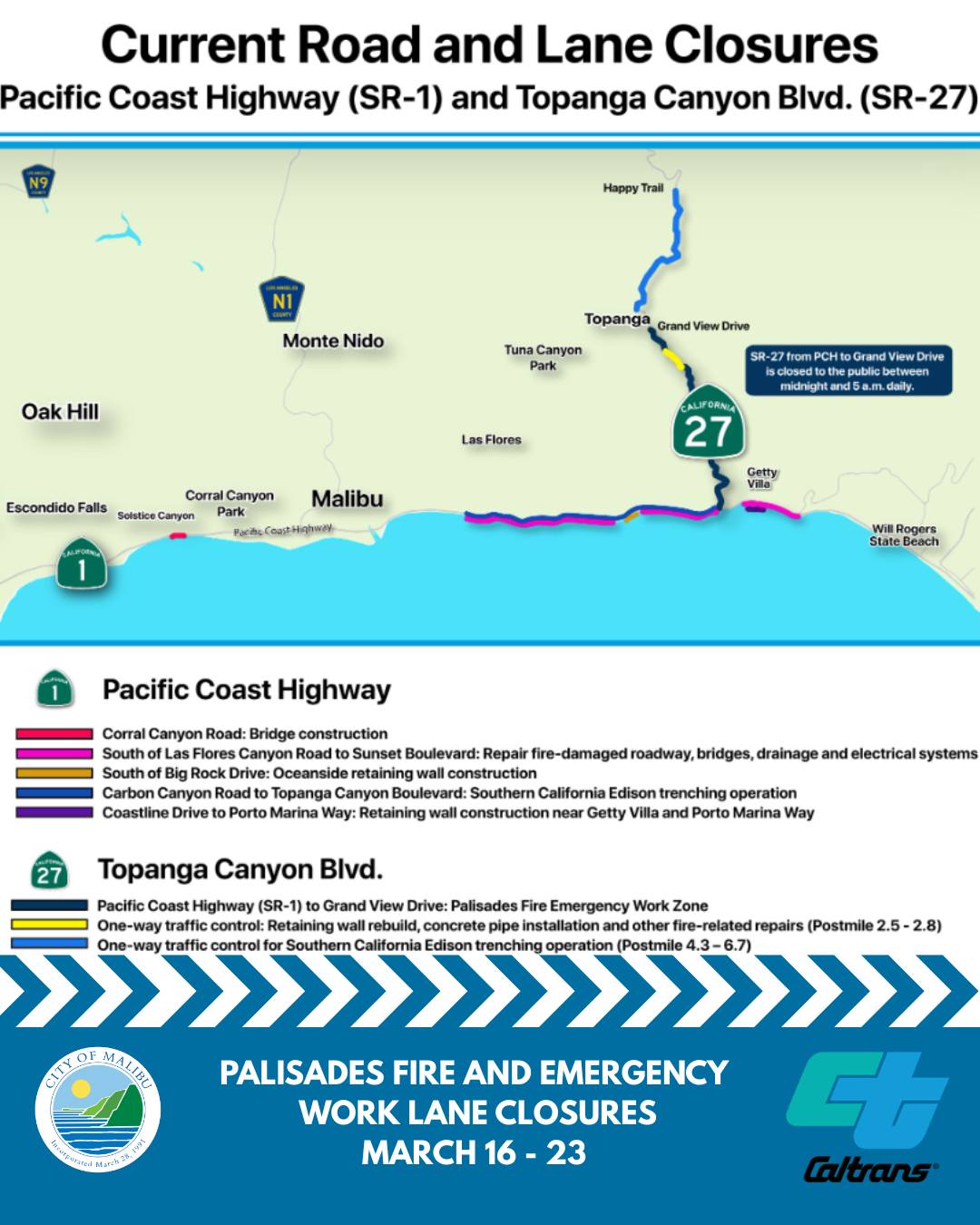 MALIBU—On March 15, the city of Malibu Office of Public Safety announced that during the week of March 16 to March 23, there will be closures on parts of both Topanga Canyon Boulevard and the Pacific Coast Highway. The repair work will affect both Malibu and Pacific Palisades.