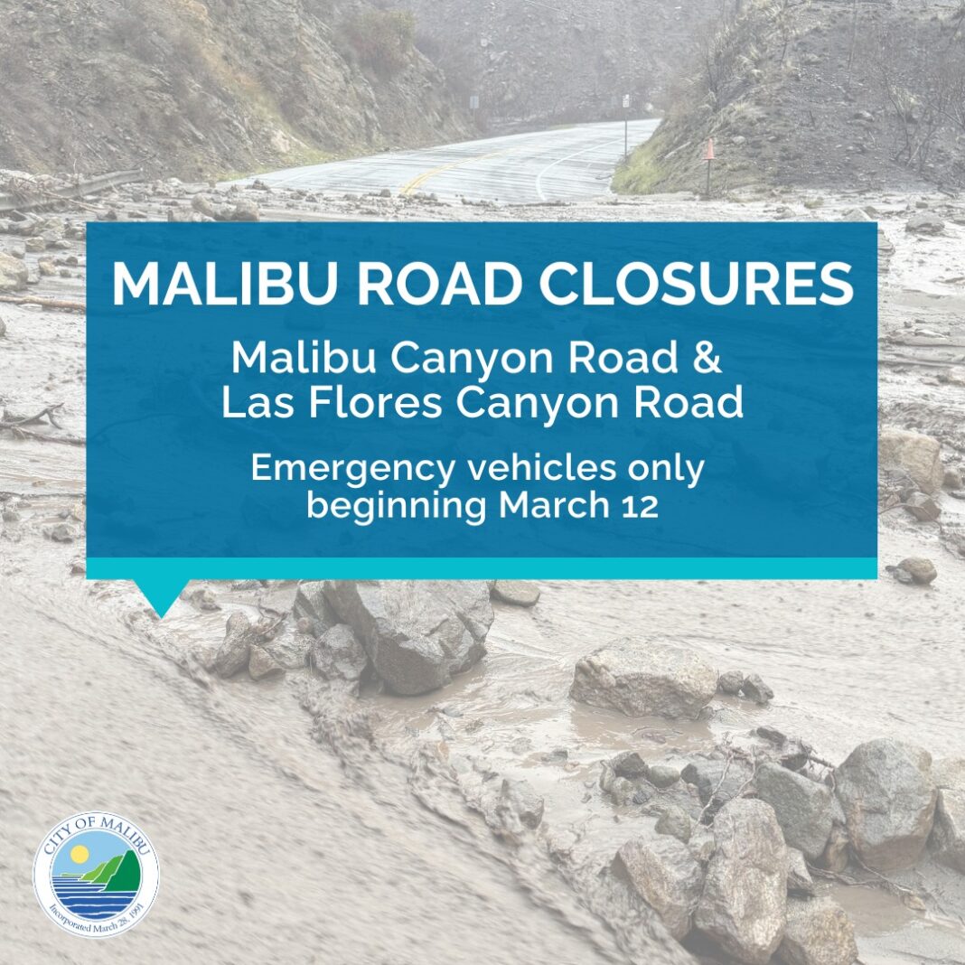 -Malibu Canyon Rd: Closed from Francisco Ranch Road (1.5 miles north of PCH) to Piuma Road to all but emergency vehicles beginning at 6 p.m. Tentative reopening planned for Thursday, March 13 at 6 p.m., depending on conditions.