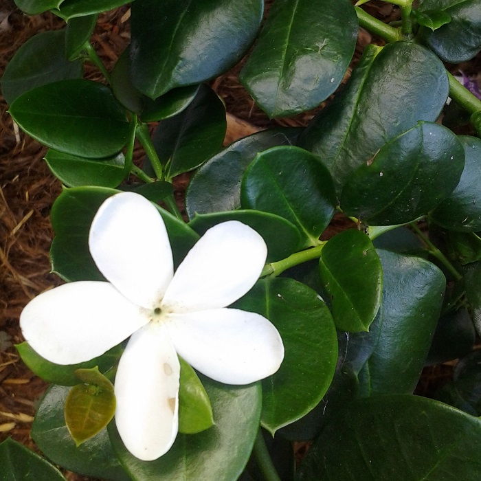 To make matters worse, all parts of Natal plum that are not fruit are toxic. But hey, they all work together to be visually appealing, even if really unfriendly. The one or two inch long evergreen leaves are quite round and stiff. The star shaped flowers that bloom as long as the weather is warm are somewhat fragrant in the evening.