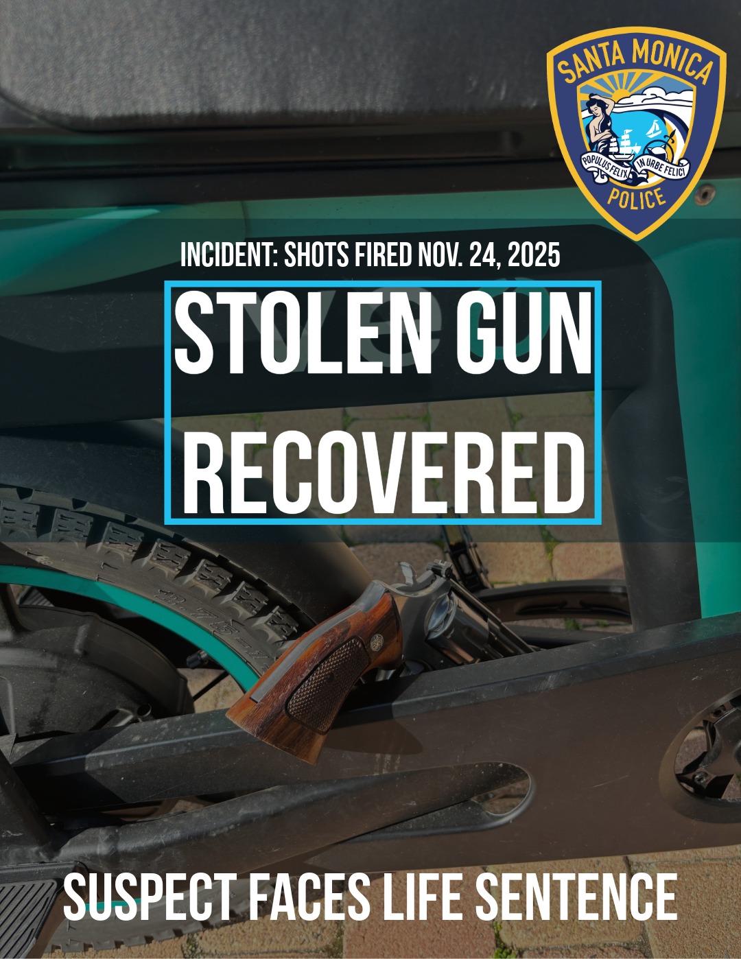 SANTA MONICA—On December 11, the Santa Monica Police Department reported that a stolen gun during a shots-fired call was recovered and that the suspect in the case faces a life sentence.