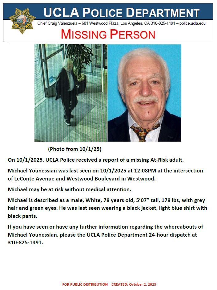 WESTWOOD—The UCLA Police Department is asking for the public’s helps to locate Michael Younessian who was last seen on Wednesday, October 1.