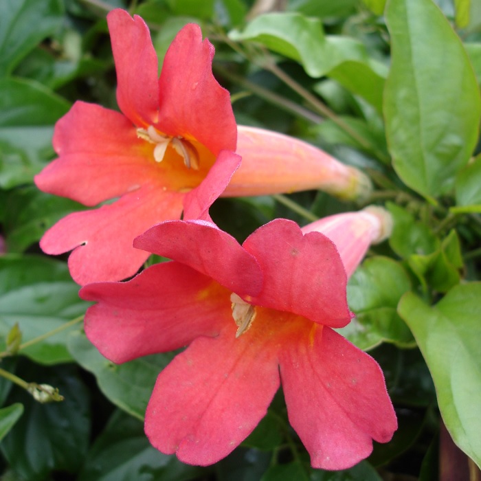 Red trumpet vine, Distictis buccinatoria, is more green than red. The tubular orangish red flowers with yellow throats are pretty while weather is warm, but not too abundant. Slightly distressed plants tend to bloom more abundantly. Each evergreen compound leaf is a pair of leaflets with a sneaky central tendril that will grab onto anything while holdfast discs get a more permanent grip.