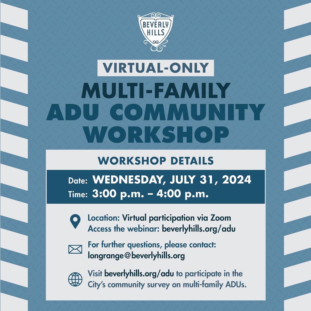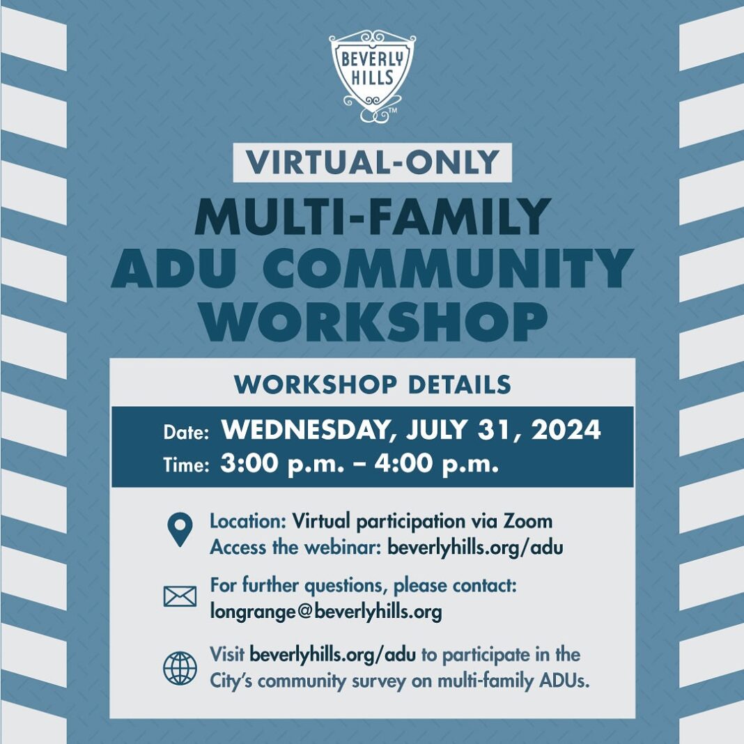 BEVERLY HILLS—The city of Beverly Hills posted on its Facebook page on Tuesday, July 16 that an interactive virtual workshop will be held on July 31 to discuss potential changes to multi-family Accessory Dwelling Unit (ADU) regulations. The virtual event will be held via Zoom.