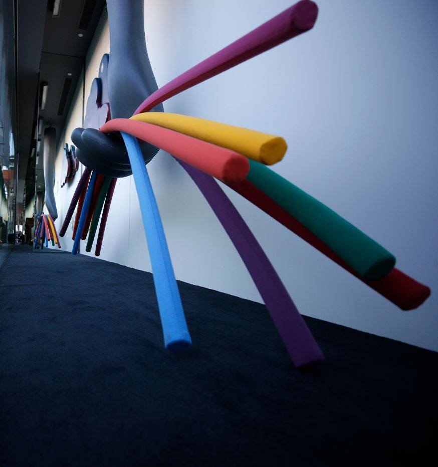 The installation a mixed-media, composed of styrofoam, aqua resin, gesso, glass, acrylic and latex paint, and neon glass bulbs. The piece incorporated the work of students who ranged from 2 to 12 years old to create a series of unique emojis. The students voted on which emojis made it to production and displayed.