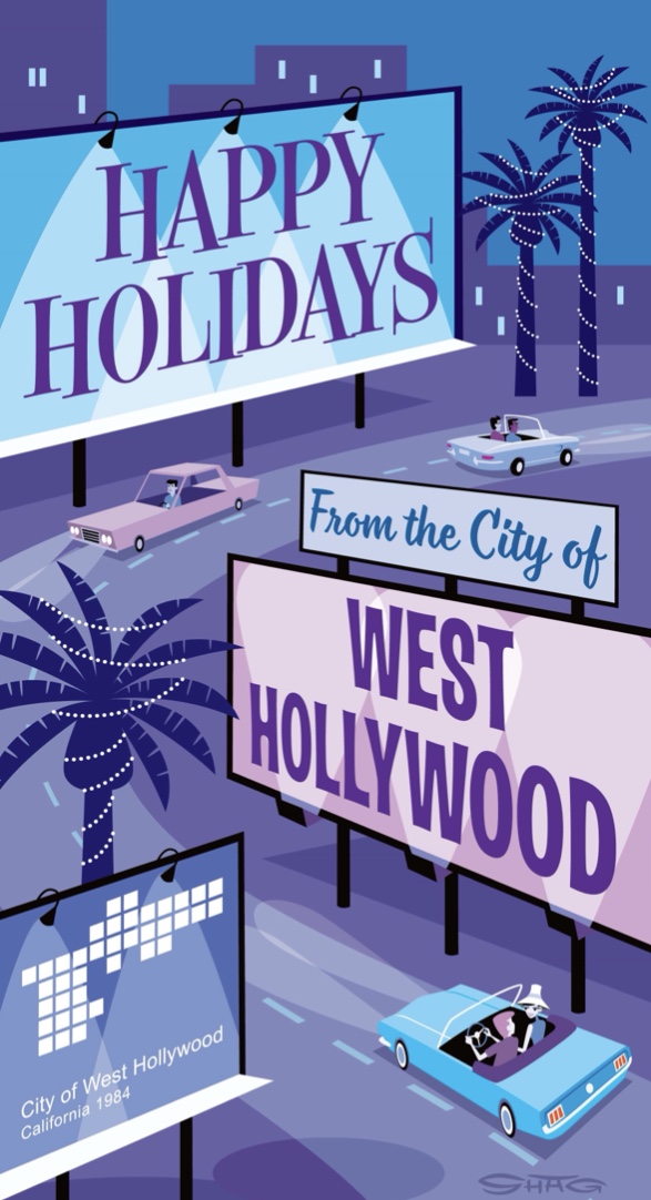 WEST HOLLYWOOD—The city of West Hollywood will host special holiday programming starting Sunday, December 8 at 12 p.m. and running until January 1, 2020. Decorative street pole banners will be featured around the city as well an original holiday card designed by artist Josh Agle.